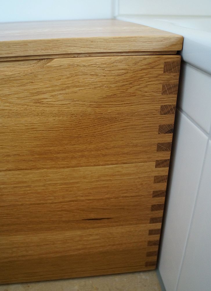 Nachdem der Hausbau so gut wie abgeschlossen war, wandten sie sich an mich. Es sollte ein Badmöbel aus der Rüster entstehen, damit der Baum im Haus weiterleben und so zu einem Erinnerungsstück für die ganze Familie werden konnte.